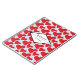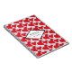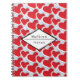 A spiral notebook with a repeating pattern of 2 different sized red hearts each heart surrounded by a white border. A diamond shaped frame layered over top with your text inside.