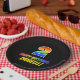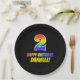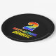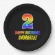 This fun, colourful, and cheerful birthday-themed paper plate design features a large number "2" and the message "HAPPY BIRTHDAY,", both coloured with a rainbow spectrum gradient inspired pattern, along with a bold yellow customisable name. It has a black coloured background. Fun, editable paper plates like this might be used at a birthday party being held to celebrate somebody’s 2nd birthday. [~Z0000488]