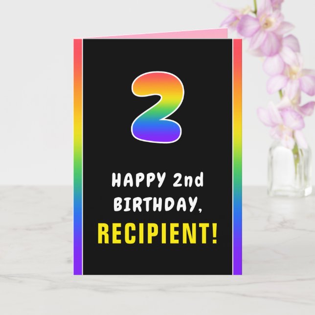 This joyful and upbeat birthday themed greeting card design features a big number “2“ with a multicolored rainbow spectrum inspired gradient pattern, along with the message “HAPPY 2nd BIRTHDAY,”, and a customizable recipient name. The inside features a custom birthday greeting message, or could perhaps be cleared and left blank if a message is to be written by hand instead. A bold, customized birthday greeting card like this might be a fun way to deliver a birthday greeting message to somebody who is celebrating their second birthday. [~Z0000636]
