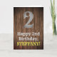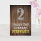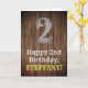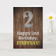 This country look and western inspired birthday greeting card design features a large rustic inspired number "2", the message "Happy 2nd Birthday,", a customisable name, and a faux/imitation wood grain inspired style pattern background. The inside has a customised birthday greeting message, or could perhaps be cleared and left blank if a message is to be written by hand instead. A customised birthday greeting card like this might be sent in celebration of somebody’s second birthday. [~Z0000469]