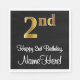 This sophisticated, stylish, and luxurious birthday themed paper napkin design features a large ordinal number “2nd” having a faux/imitation gold-like look, plus the birthday greeting message “Happy 2nd Birthday,” and an editable name in a script-style font. The background is coloured black. Birthday themed paper napkins like this might be a fun way to celebrate somebody’s 2nd birthday. [~Z0000516]