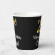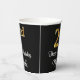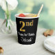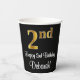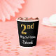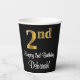 This sophisticated, elegant, and stylish birthday themed paper cup design features a large ordinal number “2nd” having an imitation/faux gold-inspired gradient pattern, along with the birthday greeting message “Happy 2nd Birthday,” and a personalised name in a script-style font. The background is coloured black. Birthday themed paper cups like this might be used at a birthday party celebrating somebody’s second birthday. [~Z0000538]