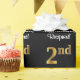 This stylish, luxurious, and elegant birthday-themed wrapping paper design features a large ordinal number “2nd” having an imitation/faux gold-like gradient pattern, along with the birthday greeting message “Happy 2nd Birthday,” and a personalised recipient name in a script-style font. The background is coloured black. Elegant birthday themed wrapping paper like this might be used when giving a gift or present in celebration of somebody’s second birthday. [~Z0000515]