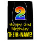 This fun, colourful, and exciting birthday themed gift bag design features a large number "2" with a rainbow spectrum gradient inspired pattern, along with the message "Happy 2nd Birthday,", and a custom recipient name. It also has a black-coloured background. A fun giftbag like this might be used when wrapping presents being given to somebody in celebration of their second birthday. [~Z0000512]