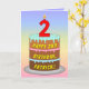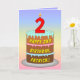This upbeat and fun birthday themed greeting card design features a cartoon-style depiction of a three-tier birthday cake having a numeral-shaped candle on top showing the number “2“, along with the message “HAPPY 2ND BIRTHDAY,”, and a personalised recipient name. The background of the front features a multicolored pastel rainbow spectrum inspired gradient pattern. The inside has a personalised birthday greeting message, or could perhaps be cleared and left blank if a message is to be written by hand instead. A joyful, customisable birthday greeting card like this might be a fun way to send some birthday wishes to somebody who is celebrating their second birthday. [~Z0000625]