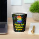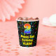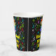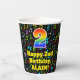 This exciting and fun music-themed birthday paper cup design features a large number “2” having a rainbow spectrum gradient inspired pattern. It also features the message “Happy 2nd Birthday,”, and a personalised name. The background features a colourful music notes and symbols pattern. Vibrant, colourful paper cups like this might be fun to have at a birthday party being held to celebrate somebody’s 2nd birthday. [~Z0000541]