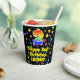 This exciting and cheerful birthday-themed paper cup design features a large number “2” having a rainbow spectrum gradient inspired pattern. It also features the message “Happy 2nd Birthday,”, and a personalised name. The background features an exciting and colourful pattern featuring many star shapes with different colours and sizes. Colourful, vibrant paper cups like this might be fun to use at a birthday party being held to celebrate somebody’s 2nd birthday. [~Z0000540]