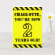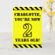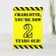The front of this fun and attention-grabbing birthday themed greeting card design features a custom name and the message "YOU’RE NOW 2 YEARS OLD!" in black stencil inspired text on a yellow coloured background. There is also an eye-catching yellow and black stripes pattern at the top and bottom edges of the front. The inside features a custom birthday greeting message, or could perhaps be cleared and left blank if a message is to be written by hand instead. A birthday card like this might be a fun way to send birthday wishes to somebody who is celebrating their second birthday. [~Z0000413]