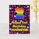 The front of this happy and joyful birthday themed greeting card design features a large number “2” having a rainbow spectrum gradient inspired pattern. It also features the message “Happy 2nd Birthday,”, and a customizable name. The background of the front features a pattern of heart shapes with colors like red, purple, and pink. The inside has a customized birthday greeting message, or could perhaps be cleared and left blank if a message is to be written by hand instead. An upbeat, customizable birthday greeting card like this might be a fun way to deliver some birthday wishes to somebody who is celebrating their second birthday. [~Z0000551]