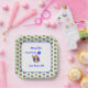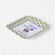 A square shaped birthday plate for a two year old, which co-ordinates with the round version. All items of text can be personalised: Name, caption, greeting. The design features a smiling monkey with a bright blue balloon which has the figure 2 on it. A further pattern of monkeys on a pale green background decorates the edge of the plate.