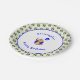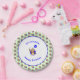 This cheeky monkey has a blue balloon to celebrate a boy or girl's second birthday. Editable text - add a name and a birthday greeting for example. There is a pattern on a light green background of more smiling monkeys around the edge of the plate.