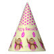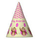 This cream coloured hat has text ready for you to personalise, and a row of cheeky smiling monkeys with birthday balloons. These bright pink balloons have the number two on them, and the design is completed with a pattern of pink spots.