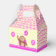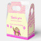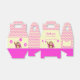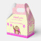 A smiling monkey and pink party balloons decorate the front and back of this box in celebration of a boy or girl's second birthday. The text on the top and front of the box is fully editable and currently reads "Thank you" "FOR HELPING US CELEBRATE" "Rowan's Second Birthday". On the side of the box there is further editable text, with a suggestion to note the name of the recipient: "This party box belongs to". The box background colour is cream and a pattern of pink dots completes the design.