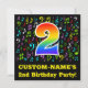 The front of this fun, vibrant, and colourful birthday party invitation design features a large number "2" with a rainbow spectrum gradient inspired pattern, along with an editable name and the message "2nd Birthday Party!". Part of the background features a fun pattern of various music notes and symbols having a variety of colours and sizes. The back features customisable information/details about the event that the potential guests are being invited to. Happy, editable birthday celebration invitation cards like this might be used when inviting guests to attend a celebration being held to honour somebody’s second birthday. [~Z0000427]