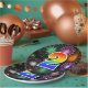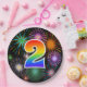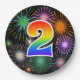 This fun, colourful, and cheerful paper plate design features a large number "2" containing a rainbow spectrum gradient inspired pattern colouring. It also features a exciting and vibrant bursting celebratory fireworks inspired pattern. It has a black coloured background. Paper plates like this might be fun to use at a party being held to celebrate somebody’s second birthday, a 2nd anniversary, or some other 2nd event. [~Z0000490]
