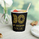 This 1920s/1930s style inspired and vintage style birthday themed paper cup design features a large art deco inspired style number “30”, in addition to the birthday greeting message “Happy 30th Birthday,” and a personalised name. The background is coloured black. 1920s/1930s style inspired birthday themed paper cups like this might be used at a party celebrating somebody’s thirtieth birthday. [~Z0000546]