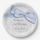 Elegant 30th Birthday Party Paper Plates for women. 30th birthday party plates for birthdays. Beautiful white damask pattern background with a pretty, stylish romantic blue bow and ribbon image. These glamourous, chic, classy custom party paper plates are beautifully sophisticated and is are perfect for all ages. All text is fully customisable to meet your requirements. PLEASE NOTE: All cake picks on Zazzle have flat printed images. Bow and ribbon images purchased from digital-designs-by-elena. If you need any assistance customising your product please contact me through my store and I will be happy to help.