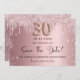 A girly and trendy Save the Date card for a 30th birthday party. Blush pink gradient background decorated with pink and faux silver glitter drips and dust. Personalise and add a date and name/text. The text: Save the Date is written with a large trendy hand lettered style script. Number 30 with a balloon style font.