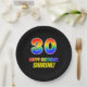 This cheerful, fun, and colourful birthday-themed paper plate design features a large number "30" and the message "HAPPY BIRTHDAY,", both coloured with a rainbow spectrum gradient inspired pattern, along with a bold yellow customisable name. The background is coloured black. Fun, customisable paper plates like this might be used at a party being held to celebrate somebody’s thirtieth birthday. [~Z0000488]