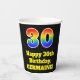 This fun and exciting birthday themed paper cup design features a large number “30” having a rainbow spectrum gradient inspired pattern. It also features the message “Happy 30th Birthday,”, and a customisable name. It also has a black-coloured background. Colourful, vibrant paper cups like this might be fun to use at a birthday celebration/party being held to honour somebody’s 30th birthday. [~Z0000537]