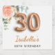 For an elegant and feminine 30th birthday birthday party. A chic white background. Decorated with a rose gold and blush pink watercolored rose flower, floral, green eucalyptus leaves, sprigs, greenery and faux gold sprigs. Personalise and a name. Black and golden letters. The name is written with a modern hand lettered style script. Number 30 is written with a golden balloon style font.