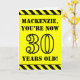The front of this attention-grabbing and bold birthday themed greeting card design features a personalized name and the message "YOU’RE NOW 30 YEARS OLD!" in black stencil style text on a yellow colored background. There is also an eye-catching black and yellow stripes pattern at the top and bottom edges of the front. The inside features a customizable birthday greeting message, or could perhaps be cleared and left blank if a message is to be written by hand instead. A customizable birthday card like this might be a fun way to send a message in celebration of somebody’s thirtieth birthday. [~Z0000413]