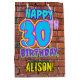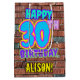 The front of this fun birthday-themed gift bag design features the message “HAPPY 30TH BIRTHDAY,” having a colourful, vibrant, graffiti and urban street art inspired appearance, along with a personalised recipient name. The background features a pattern inspired by the look of a brick wall. A colourful gift bag like this might be used when giving a gift or present in honour of somebody’s thirtieth birthday. [~Z0000536]