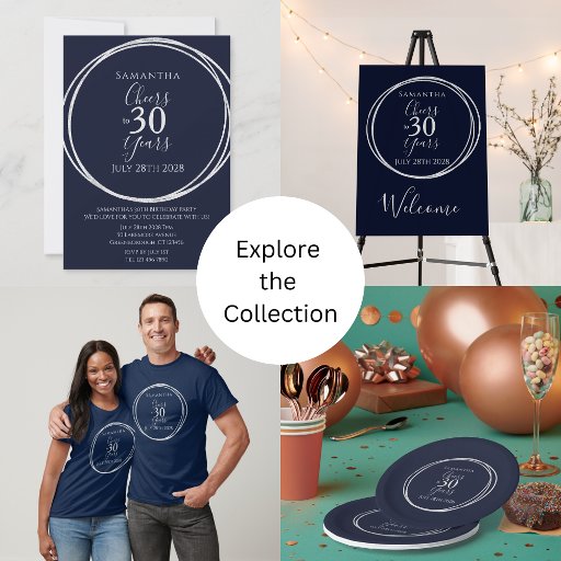 This is a chic and elegant 30th birthday party design. This stylish design is in trending navy and silver. It has the message, "Samantha", "Cheers to 30 years" and the celebration date. This modern, typography motif is framed by an elegant silver foil effect circle. This stylish design is perfect for a chic and unforgettable 30th birthday party or celebration. To personalise, simply add your name and date in the personalise this text box. To change the colour or font, check out the design editing tool. If you need help with personalisation, or for a custom design contact me via zazzle chat.