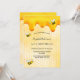 Elegant, fun, 30th birthday summer party invitation. Yellow, white background with a honeycomb pattern. Decorated with golden, dripping sweet honey and happy bumble bees. The name is written with a modern hand lettered style script. Black letters. Perfect for a summer tea party in a garden, backyard.