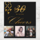 A bottle label for a glamourous 30th birthday party. Personalise and add 3 of your own photos, a name, age 30 and a date. Date of birth or the date of the party. Golden coloured letters. The word: Cheers, in faux gold written with a trendy hand lettered style script. Elegant, classic chic black background colour, decorated with faux gold party streamers.