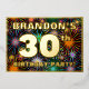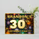 The front of this eye-catching thirtieth birthday party foil invitation card design features a personalised name, a large number “30th”, the message “BIRTHDAY PARTY!”, and a border. The background of the front features a joyful, colourful pattern inspired by bursting celebratory fireworks. The back features personalised details about the event, such as the date, time, place, and any other information that may be important. Editable invitations like these might be a fun way to invite guests/attendees to a birthday gathering being held in celebration of somebody’s 30th birthday. [~Z0000602]