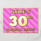 The front of this joyful and loving thirtieth birthday party/celebration foil invitation card design features an editable name, a large number “30th”, the message “BIRTHDAY PARTY!”, and a border. The background of the front has a fun dark pink and light pink striped pattern, with heart shapes. The back features personalised details about the event, such as the date, time, location, and any other useful information. Personalised invitations like these might be a fun way to invite attendees/guests to a birthday gathering being held to honour somebody’s 30th birthday. [~Z0000603]