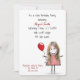 Stick figure girl with red balloon, blonde hair, pearl necklace, gingham dress, and sneakers on white background for 30th birthday party.