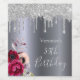 A label for a 30th birthday party. A dark faux silver metallic looking background. Decorated with dark purple and burgundy and rose pink flowers, faux silver glitter dripping, paint drip look. Templates for a name. The text: 30th Birthday is written with a large modern hand lettered style script.