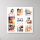 A unique 30th birthday gift or keepsake, celebrating her life with a collage of 8 of your photos. Add images of her family, friends, pets, hobbies or dream travel destination. Personalise and add a name, age 30 and a date. Grey and black coloured letters. A chic white background. This canvas is also available in our store with black or rose gold coloured background.