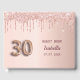 A guestbook for a girly and glamourous 30th birthday party. A faux rose gold background with rose gold faux glitter drips, paint dripping look. Personalise and add a name and date. The name is written in dark rose gold with a modern hand lettered style script. Number 30 is written with a balloon style font.