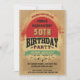 Funky 30th birthday party invitations template. Mens' or womens' colourful unisex vintage retro style personalised birthday party invites. Woman's or man's affordable personalised custom thirtieth / thirty years / 30 year old birthday party celebration invitations with a beautiful, elegant, groovy, retro themed design with a grungy star burst vector illustration in red with ornate brown calligraphic / calligraphy swirls and flourishes ornaments and trendy retro typography / text design and green banners on a tan / beige and yellow grunge background. A cool, modern, fashionable, design for men or women with a vintage style theme. These stylish, classy, pretty, grunge, shabby chic invites are printed / decorated on both sides. PLEASE NOTE:- All invitations on Zazzle have flat printed images. If you need any assistance customising your product, please contact me through my store and I will be happy to help.