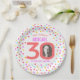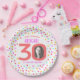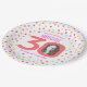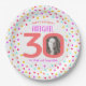 Bright colourful confetti random dots birthday 30th surprise party paper plates. In bright living coral, hot pink, golden yellow and aqua blue green. Add your own birthday girl's photo in the centre of the 0 in 30 and customise with your own thirtieth birthday date, time and party details. Other matching items and milestone birthday years available. Original design by www.mylittleeden.com on zazzle.
