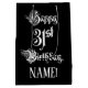 This elaborate and formal birthday-themed gift bag design features the message “Happy 31st Birthday,” in opulent script style text, on a black coloured background. It also has a custom recipient name. A birthday themed giftbag like this might be a respectable way to wrap a gift or present being given to celebrate somebody’s thirty first birthday. [~Z0000557]