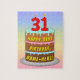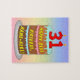 This fun and colourful birthday themed jigsaw puzzle design features a cartoon-style depiction of a three-tier birthday cake having numeral-shaped candles on top showing the number “31“, along with the message “HAPPY 31ST BIRTHDAY,”, and a customisable recipient name. The background features a multi-colour pastel rainbow spectrum inspired gradient pattern. A cheerful, customised birthday puzzle like this might be a fun way to send birthday wishes to somebody who is celebrating their thirty-first birthday. [~Z0000621]