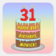 This fun and upbeat birthday-themed square sticker design features a cartoon-style depiction of a three-tier birthday cake having numeral-shaped candles on top showing the number “31“, along with the message “HAPPY 31ST BIRTHDAY,”, and a custom recipient name. The background features a multi-colour pastel rainbow spectrum inspired gradient pattern. Stickers like these might be given out or used at a birthday party held for somebody who is celebrating their thirty-first birthday, or perhaps used when wrapping presents/gifts or preparing invitations for such an event. [~Z0000624]