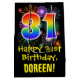 This colourful, fun, and exciting birthday themed giftbag design features a large number "31" with a rainbow spectrum gradient style pattern, along with the message "Happy 31st Birthday,", and a customisable recipient name. It also has a colourful background pattern inspired by the appearance of bursting celebratory fireworks. A gift bag like this might be used when giving a gift or present in honour of somebody’s thirty first birthday. [~Z0000509]