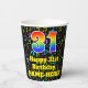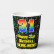 This fun and cheerful music themed birthday paper cup design features a large number “31” with a rainbow spectrum gradient inspired pattern, along with the message “Happy 31st Birthday,”, and an editable name. The background features a colourful pattern having music notes and symbols of various sizes and colours. Colourful, vibrant paper cups like this might be fun to have at a birthday celebration/party being held to honour somebody’s thirty first birthday. [~Z0000541]