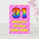 The front of this cheerful and fun 31st birthday-themed greeting card design features a large number "31" having a colorful rainbow spectrum inspired gradient pattern. It also features the message "Happy 31st Birthday,", followed by a personalized recipient name. The background of the front features a dark pink and light pink stripes pattern containing loving pink heart shapes. The inside features a personalized birthday greeting message, or could perhaps be cleared and left blank if a message is to be written by hand instead. A birthday card like this might be a fun way to send birthday wishes to somebody who is celebrating their thirty first birthday. [~Z0000416]
