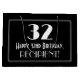 This 1920s-1930s style inspired vintage appearance birthday-themed gift bag design features a large art deco look inspired number "32", the message "Happy 32nd Birthday,", a personalised name, and a border pattern consisting of thin lines. The background is coloured black. A gift bag like this might be used when wrapping presents being given to somebody in celebration of their thirty second birthday. [~Z0000496]