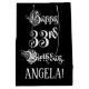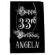 This lavish and fancy birthday themed gift bag design features the message “Happy 33rd Birthday,” in opulent script style text, on a black coloured background. It also has a custom recipient name. A gift bag like this might be used when giving a gift or present in honour of somebody’s 33rd birthday. [~Z0000557]