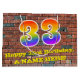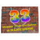 This fun and colourful birthday gift bag design, inspired by street art and graffiti, features a large number "33" having a rainbow spectrum gradient inspired pattern. It also features the message "Happy 33rd Birthday,", and a personalised name. The background features a brick wall style pattern. A vibrant giftbag like this might be used when wrapping presents being given to somebody in celebration of their 33rd birthday. [~Z0000522]
