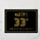 The front of this Roaring Twenties inspired thirty-third birthday party/celebration foil invitation features a custom name, a large art deco style inspired number “33RD”, the message “BIRTHDAY PARTY!”, and a border pattern consisting of lines. There is a black-coloured background on the front by default, but it can be customised to a different colour if desired. The back features personalised details about the event, such as the date, time, location, and any other information that may be relevant. Elegant, luxurious, editable invitations like these might be used to invite guests to a birthday celebration being held to honour somebody’s 33rd birthday. [~Z0000590]