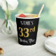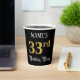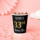 This elegant and ornate birthday-themed paper cup design features a customizable name and the message “33rd Birthday Party”. The large number “33rd” has an imitation/faux gold-inspired coloring pattern, and the words “Birthday Party” are in luxurious script-style text. The background is colored black by default (although it can be customized). Luxurious, opulent paper cups like this might be useful to have at a birthday celebration being held to honor somebody’s 33rd birthday. [~Z0000567]