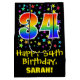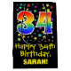 This fun, exciting, and colourful birthday themed gift bag design features a large number "34" with a rainbow spectrum gradient inspired pattern, along with the message "Happy 34th Birthday,", and an editable recipient name. It also has a colourful background pattern featuring star shapes of various sizes. A fun gift-bag like this might be used when wrapping presents being given to somebody in celebration of their thirty fourth birthday. [~Z0000510]